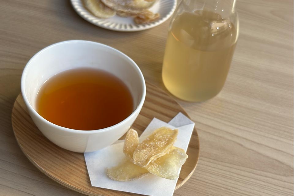 加熱と乾燥の加工を取り入れて作るのが、昔ながらのお菓子「生姜糖」。1枚食べれば、ピリリとした辛味とともに体がほっこり温まります。煮汁の「生姜シロップ」は、紅茶やほうじ茶に入れるほか料理の調味料としても活用できます。